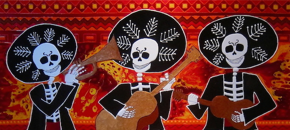 Thursday night, Rialo’s Mexicana, three blocks off Trump Plaza Casino Hotel, Atlantic City. It’s late for dinner, but early for drinks. I ordered take-out, and you’re eating in. You are at a table, beneath Mariachi skeletons, not far from the table we used to call “our table.” Tonight your table is bigger and filled with happy strangers.