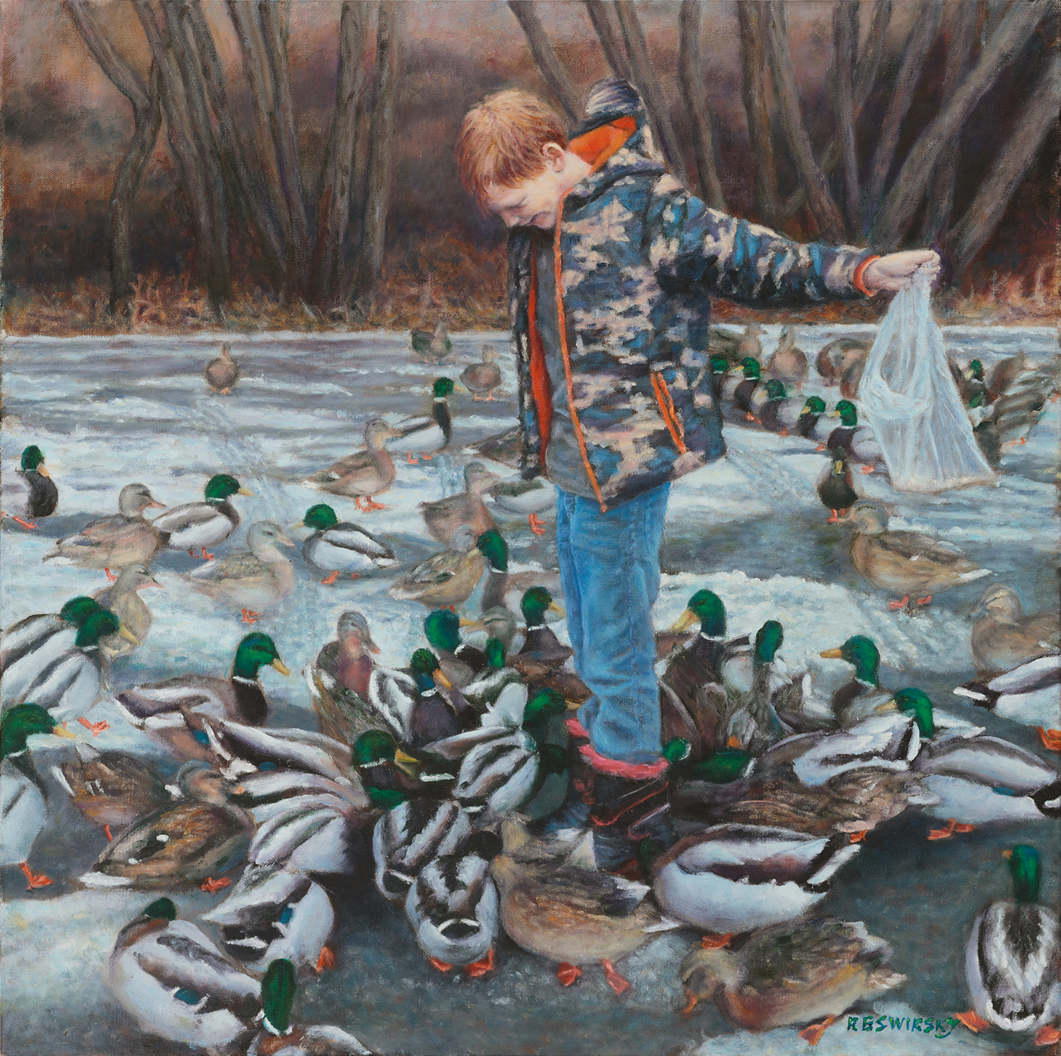 A Boy and his Ducks | 24” x 24” | Oil on Canvas My greatest challenge in creating this piece was to choose the right balance of colour and detail in the composition to ensure the viewer’s focus always returned to the expression of delight on the young boy’s face. The bright colours on the trim of both coat and boots were the perfect complement to the orange of the ducks feet bringing warmth into this otherwise cool winter scene. My style of painting is evident in this piece with a looser painterly feel on the ducks and snow moving to a slightly finer detail on the boy’s face.