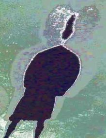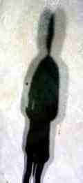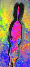All of these figures were derived from digital photographs of real shadows of people standing on concrete pavement at an amusement center. The shadows were created by two very bright area lights which produced a double and overlapping effect. By processing the entire image in Paint Shop Pro (V.6), I was able to bring out colors, outlines and enhanced detail. Naturally I had to crop a number of these. But I did not use a paint brush, eraser, or add any lines or areas. In other words I worked on the whole image, not parts.