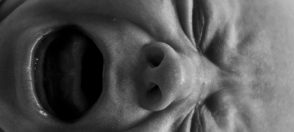 He looks down at his daughter where she lies sleeping on the padded table. Her mouth suddenly turns down aggressively, her eyes squeeze against themselves. Her lips are wet. Her bald head turns red, a balloon of thought ready to puncture itself.