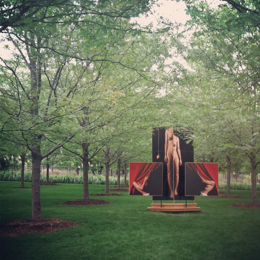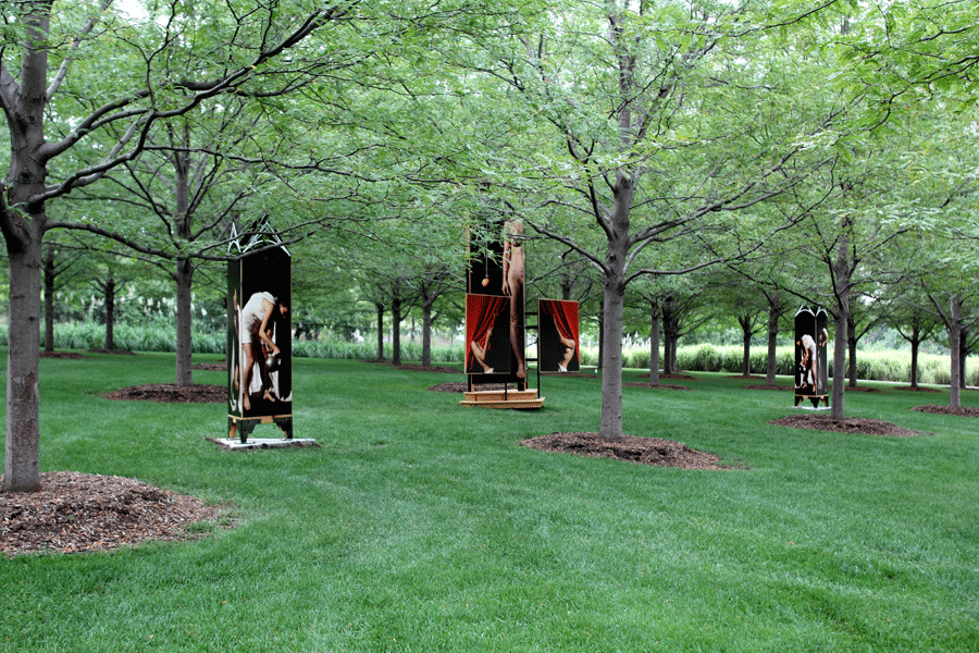 TAB: I installed a large scale photo/sculpture in the Duncan Sculpture Garden in Lincoln, NE (see below). I was given a dream site, a grid of 70 Honey Locust trees in a spectacular garden with the challenge of creating an outdoor photographic display. The Duncans are so supportive and welcoming. I got to involve other artists and several friends. The project was very enjoyable and well received.