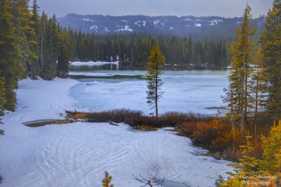 At the end of the road, a mountain lake mirrored the clear day’s colors and shadows. A snowball had been skittered onto the calm surface and perched there still; the water had frozen black and magic, as smooth and solid as glass.