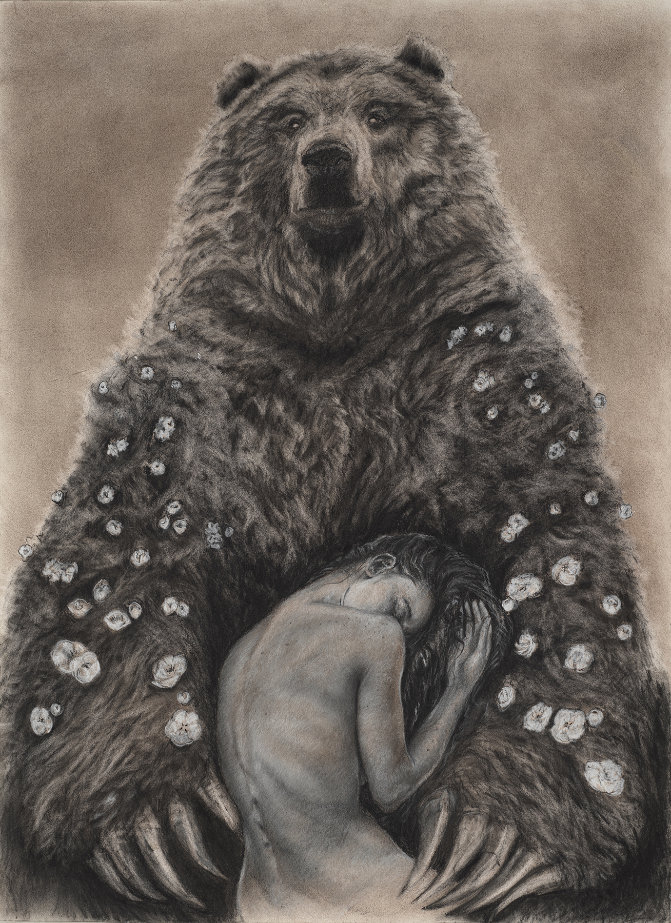 Most of my subject matter includes the female form in some form of interaction with nature and wildlife, albeit metaphorically at times.  For me, it is important to represent the female form in the most positive light, as a thing of strength and beauty.  Symbolically, there is this notion of mother nature and birth and nurturing that are the roots of everything we come from.  It’s all quite humbling when you put it into perspective.  I grew up around many strong women.  My mom, sisters, grandmother, aunts and cousins were always prominent forces in my life.   I was always very aware of the fact that the men in my family always represented the physicality of strength, while the women epitomized true fortitude. It seemed like a symbiotic relationship of sorts and quietly matriarchal. On some cellular level, all of these experiences are infused into my creative process.  The resulting visceral stream of expression is in the best case scenario, hopeful and honest.