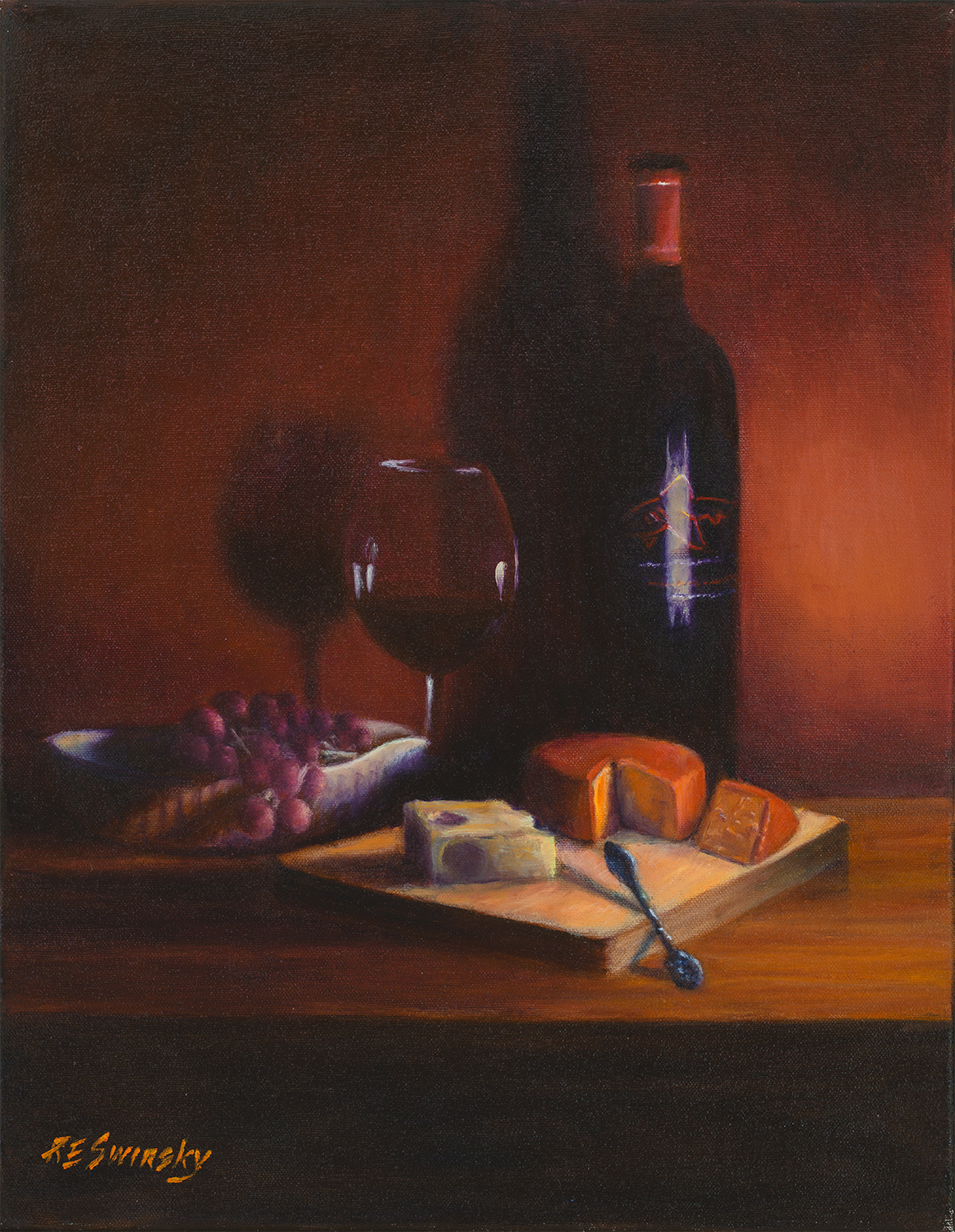 Greg Norman # 1 | 14” x 18” | Oil on Canvas Who doesn’t like a good wine and cheese? Light and shadow were essential in creating mood for this piece. I opted for a soft warm light source to allow the dark shadows to overtake and creep in and behind the objects. Notice how the wine bottle disappears into shadow between the cheese and the bowl of grapes. The many subtle value shifts in the shadows contrasting with the vibrant colours captured by the light help to create the sense of realism I was after. It is very traditional in style but a mood setter in so many ways.