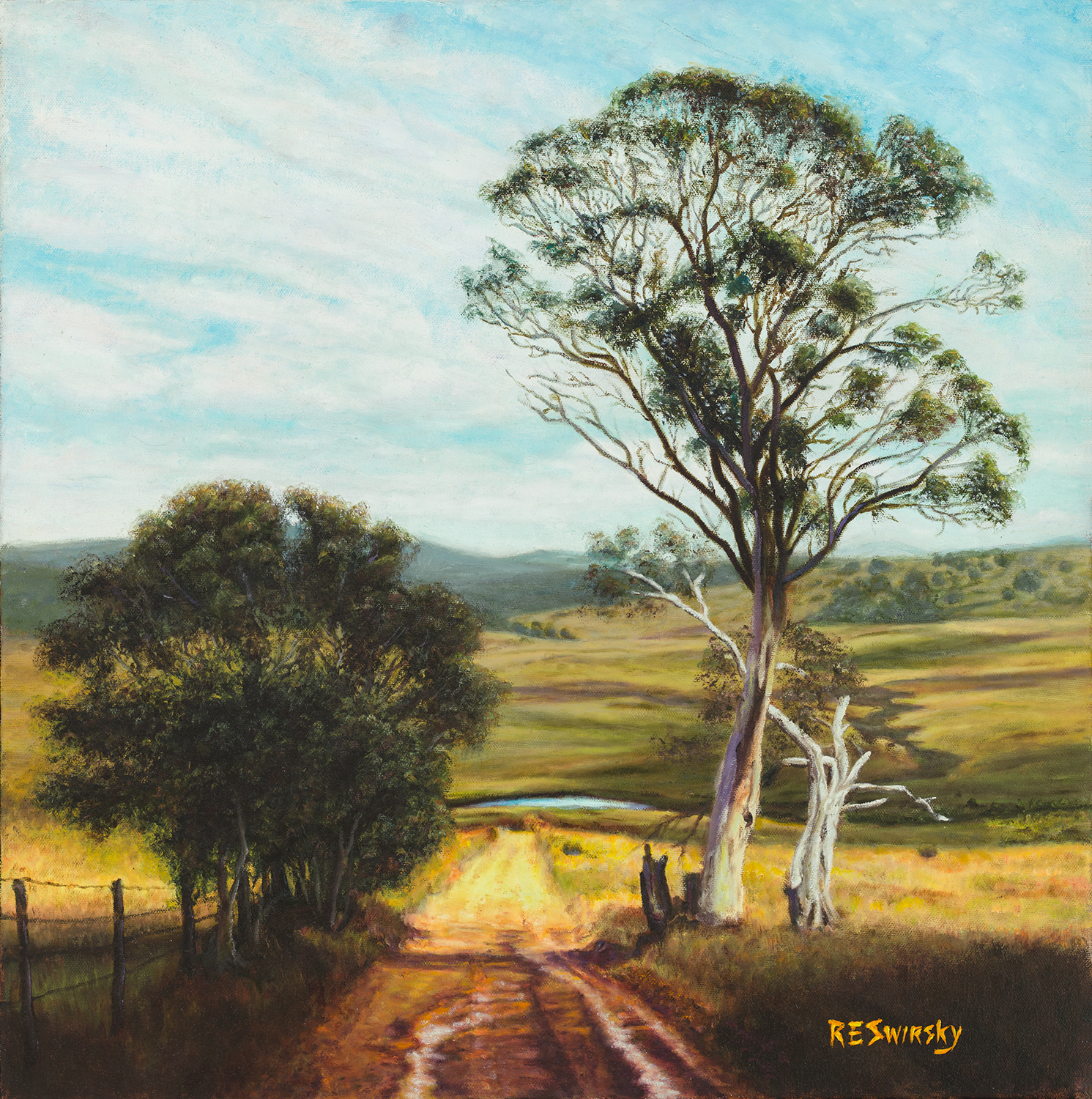 Journey from Jindabyne | 20” x 20” | Oil on Canvas This little backroad in Australia struck me by the way the sun broke through the clouds lighting this one section of dirt road while leaving the foreground in dark shadow. I like the way the road seems to disappear as it drops down a small incline. As in my other works I always try to create a sense of realism and detail using a variety of colours softly laid onto the canvas. I like the result of having an old masters kind of feel to this piece.