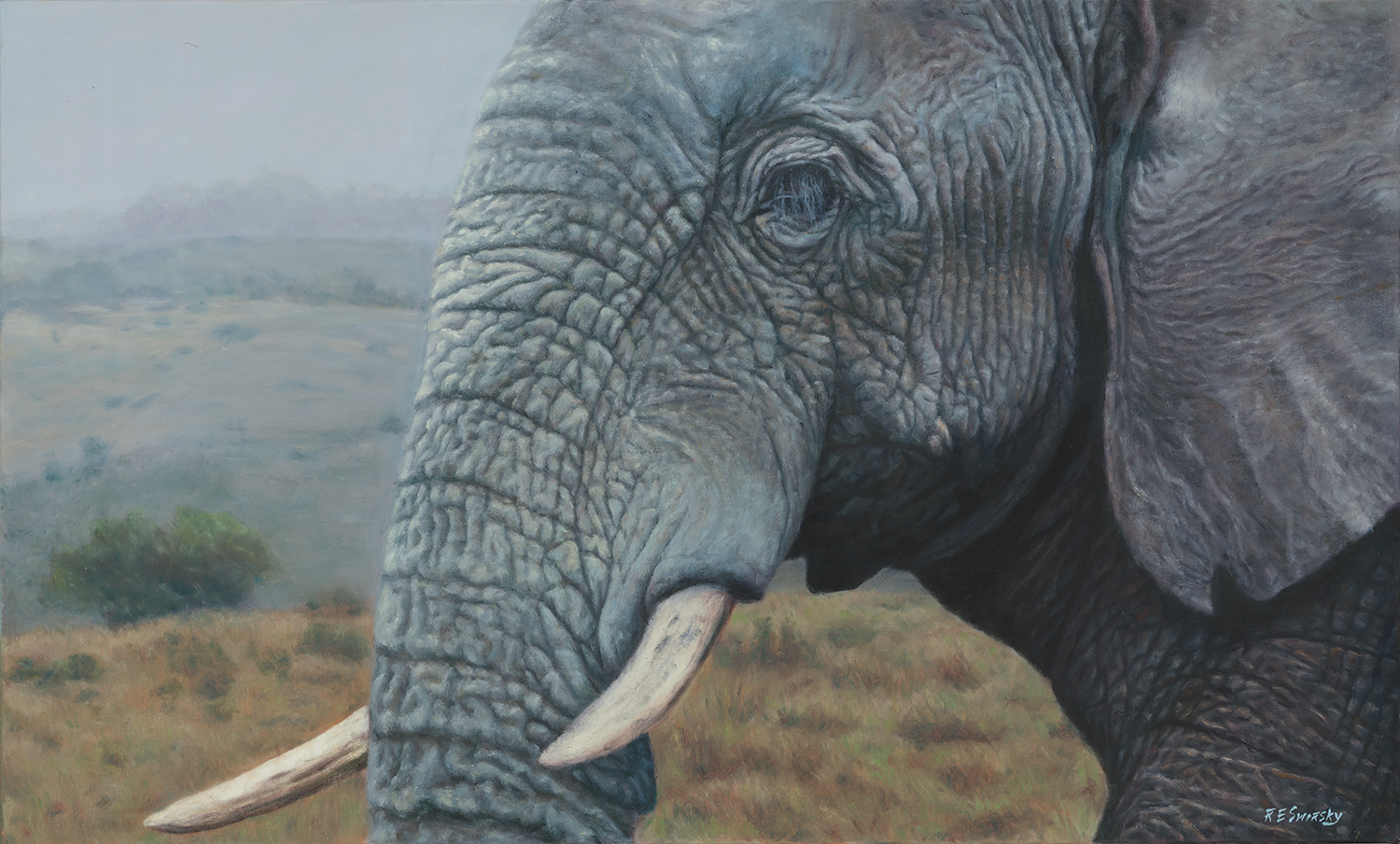 The Elephant | 24” x 40” | Oil on Canvas Like the elephant, I will never forget my brief South African encounter with this great animal. In my realistic style of painting I am always trying to avoid getting trapped too early in the finer details by keeping everything loose as long as possible. I build up details slowly using a variety of colours and values which will appear as detail as I work towards the finished piece. Creating the many wrinkles and dark shadows was crucial to balancing this composition the way I wanted it to be.