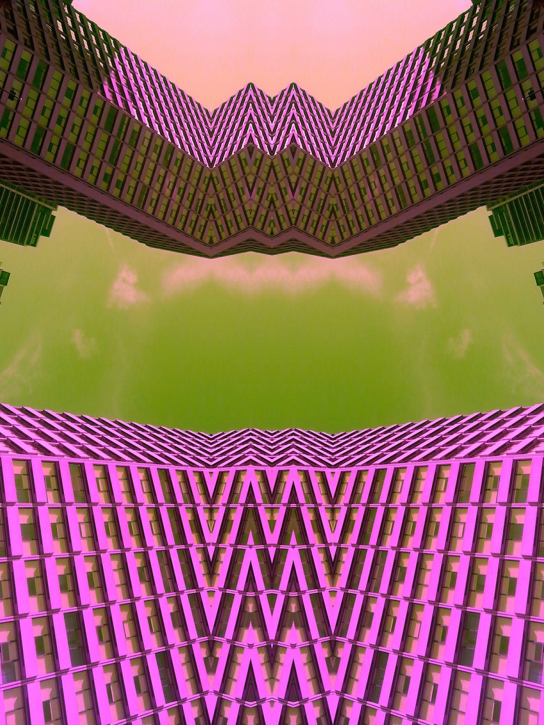 The process is simple and it emphasizes on the digital aspect of photo processing. By using digital processes such as mirroring and playing with hues, contrast and saturation, the images emerge from the digital environment to offer audiences a new way of seeing. Accentuating the grandeur of a building by mirroring its size then exaggerating its colors and pushing its expression to the limit, the image of a building becomes thus surreal-like and appear to most as a stylized version of the original, bringing to mind the science fiction and the fantasy genres. This is all too familiar to those who consider themselves fans of Blade Runner or other science fiction films which exhibit such otherworldly environments.