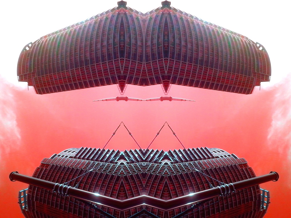 The process is simple and it emphasizes on the digital aspect of photo processing. By using digital processes such as mirroring and playing with hues, contrast and saturation, the images emerge from the digital environment to offer audiences a new way of seeing. Accentuating the grandeur of a building by mirroring its size then exaggerating its colors and pushing its expression to the limit, the image of a building becomes thus surreal-like and appear to most as a stylized version of the original, bringing to mind the science fiction and the fantasy genres. This is all too familiar to those who consider themselves fans of Blade Runner or other science fiction films which exhibit such otherworldly environments.