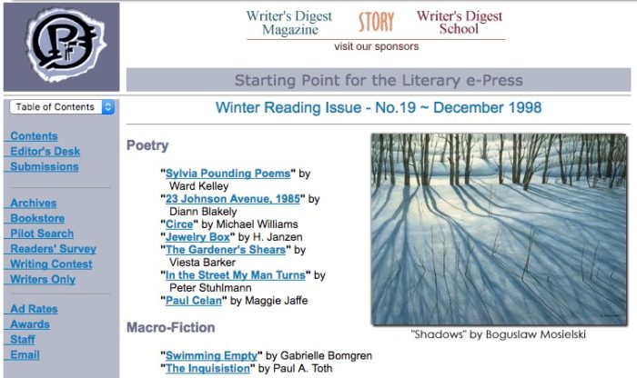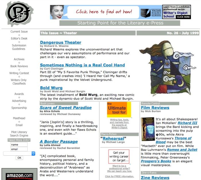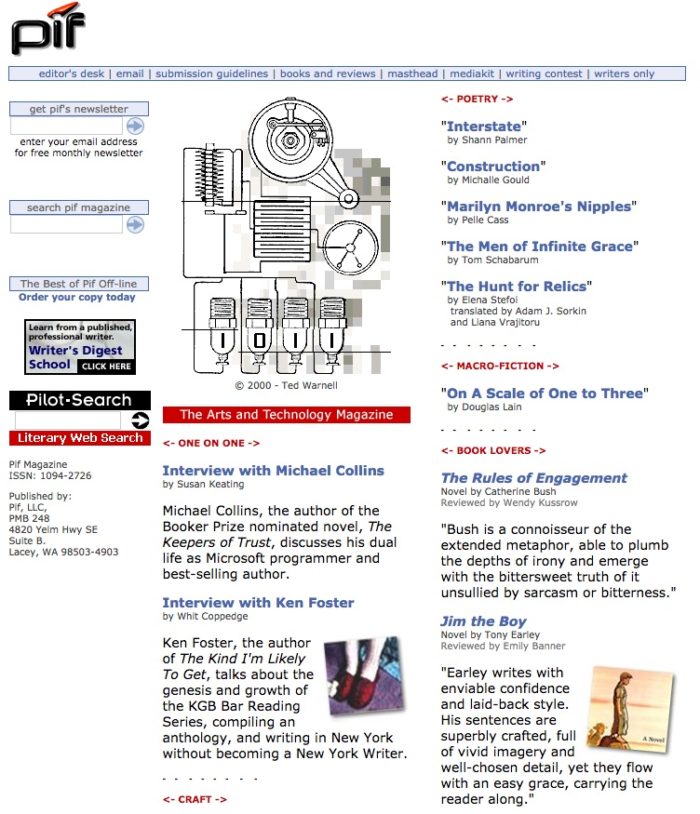 In early 1998 Pif Magazine began working with Writer’s Digest Magazine and the wonderful (now defunct) Story magazine to sell subscriptions online. Neither publication had an online presence at the time and selling subscriptions online was new to them (and to Pif). The best advertising mechanism either of us could come up with was to run banner ads on every web property Pif could access. This included Pif Magazine and Penguin Search, a literary-themed search engine of author websites, online zines, and other resources for writers. We also decided it would be a good idea to change the logo to look like it had been punched so hard by Chuck Norris as to have smashed through the raised sidebar and become imprinted upon the white page below. The late ’90’s was also a time when (nearly) every ‘zine online was proudly displaying badges for the various awards they had received from other online ‘zines.