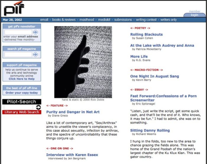 Pif has always been an advocate for new voices online. In the late ’90’s the magazine operated Zine-X, a banner-exchange network of several hundred online literary magazines. The purpose was to build awareness of (and generate readers for) all of the great new publications that were sprouting up at the time. This awareness was predominantly generated by the spread of provocative banner ads like this one across the web.
